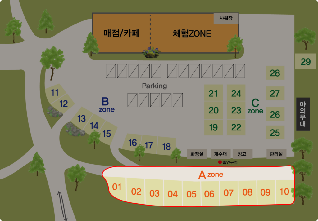 오픈한지 얼마 되지 않았는데도 문수골캠핑장을 이용했던 분들이 오신 건지 궂은 날씨에도 사이트가 거의 꽉 차 있는 모습이었습니다. 아직 홈페이지 예약 시스템이 마련되지 않아서 현재는 전화로만 예약을 받고 있습니다.