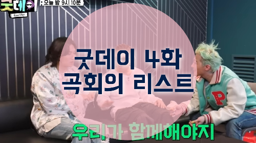 1. 굿데이 3화   요즘에 드디어 챙겨보는 예능이 생겼는데요. 지드래곤이 이끌어서 화제가 된 '굿데이'입니다. 굿데이는 지드래곤이 프로듀서가 돼서 다양한 분야의 인물들과 함께 노래를 만