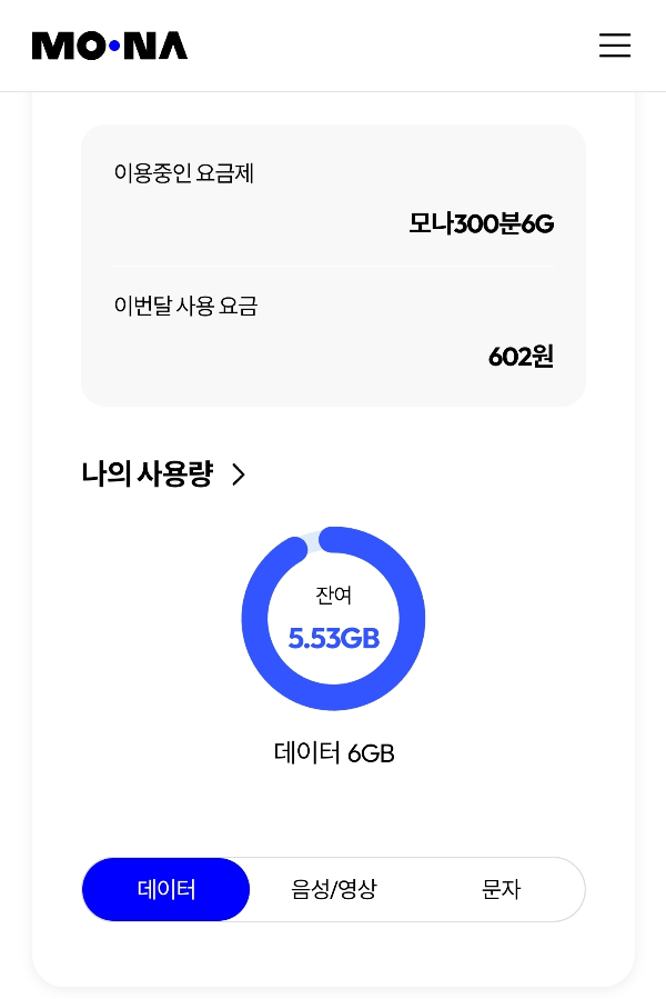 모나는 어플이 있어서 첫화면에서 나의 요금과 잔여량을 바로바로 확인할 수 있습니다!