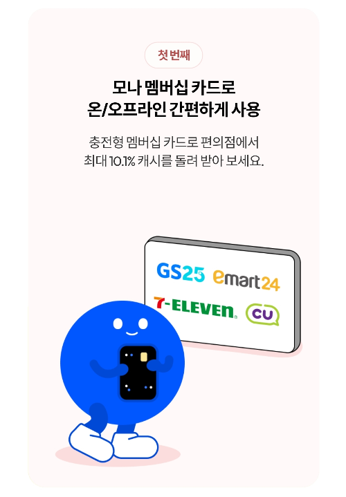 셋째, 모나 멤버십 카드로 4대 편의점에서 사용금액 10% 즉시 적립!