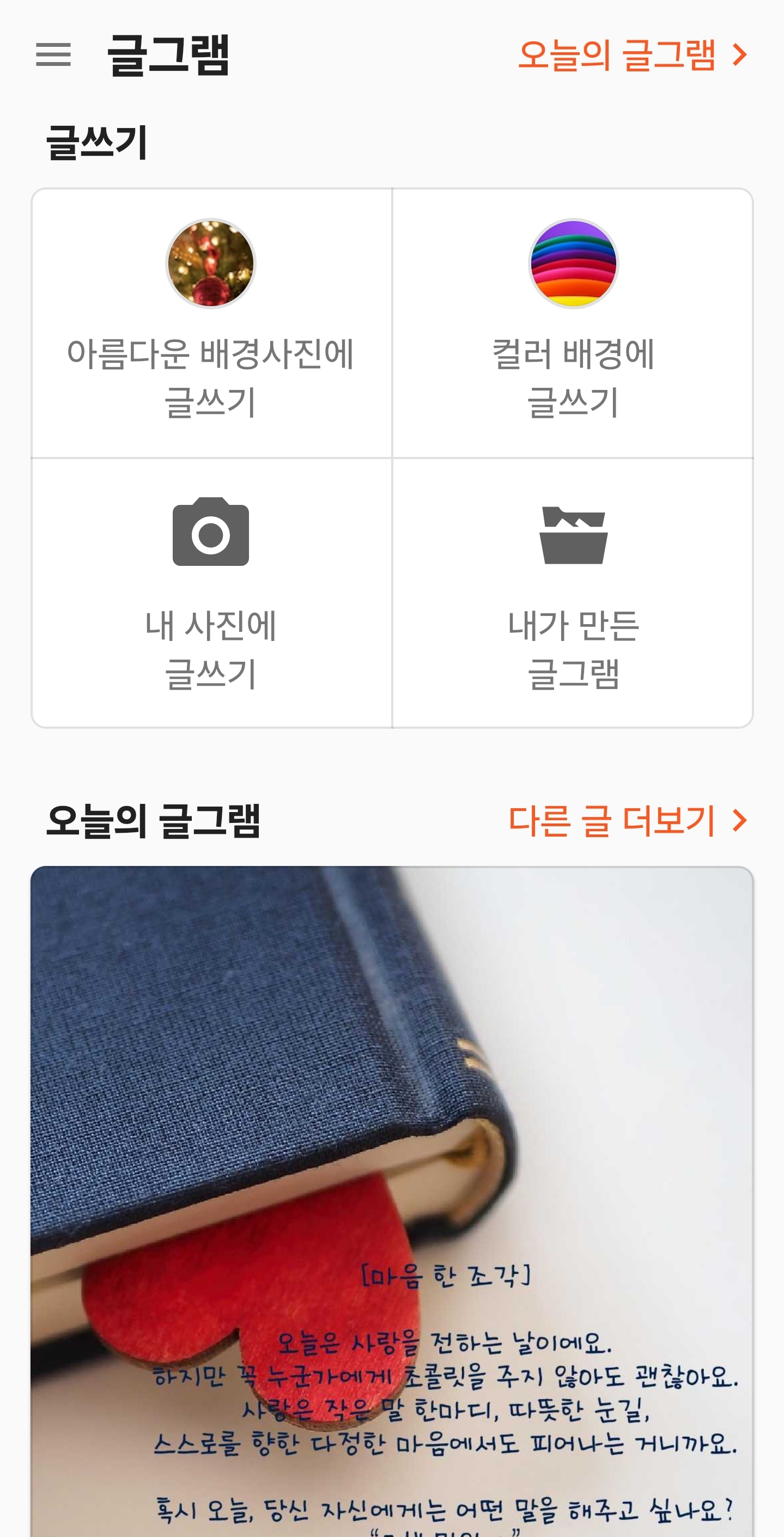 글그램은 사진에 글귀를 쓸 수 있는 어플입니다. 사진 위에 글귀를 디자인해 썸네일, 감성글, 안부인사글 등을 간편하게 만드는 데 최적화되어 있습니다.