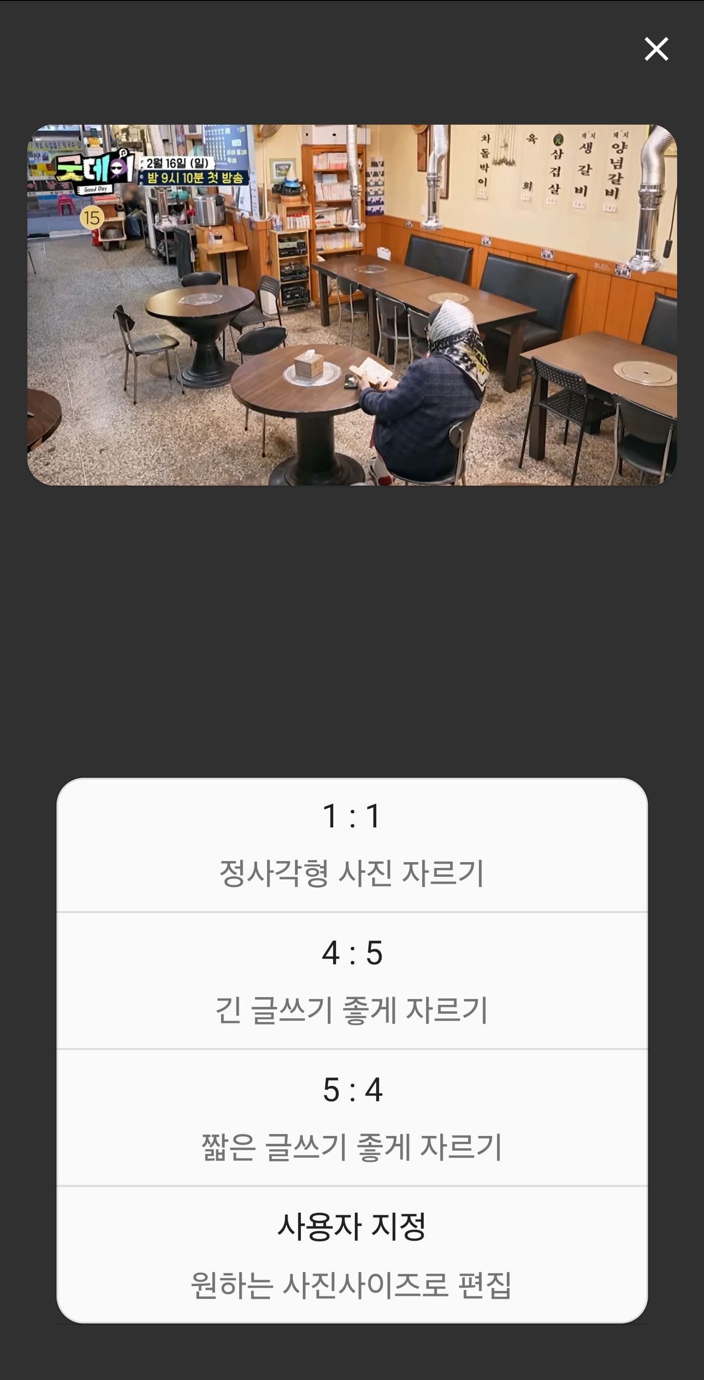 사진을 고른 후 썸네일을 만들기 위해 1:1비율 또는 사용자 지정에서 16:9를 선택합니다. 다른 용도라면 용도에 맞게 비율 선택하시면 됩니다!