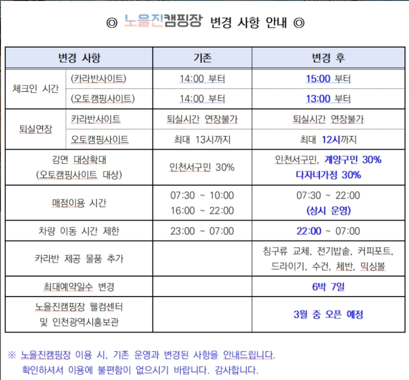 동계 캠핑장 수선유지보수 작업을 위해서 1월 20일~2월 27일까지 임시 휴장하고 있는데요. 재개장 이후에 사용자 편의를 증진시키고 혜택을 주는 변화가 있어서 더 반가운 마음이 듭니다.