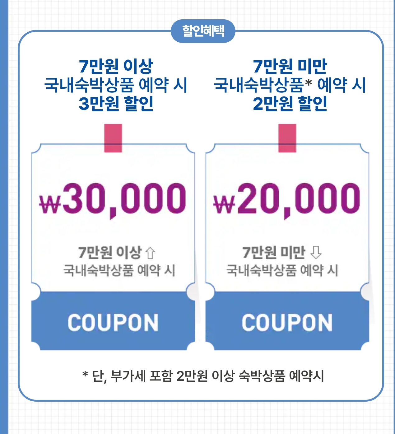 할인 혜택 : 7만 원 이상 상품 예약 시 3만 원, 7만 원 미만 상품 예약 시 2만 원 할인.